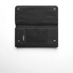 Long internal note & card compartments, mesh window card sleeves, double snap closure